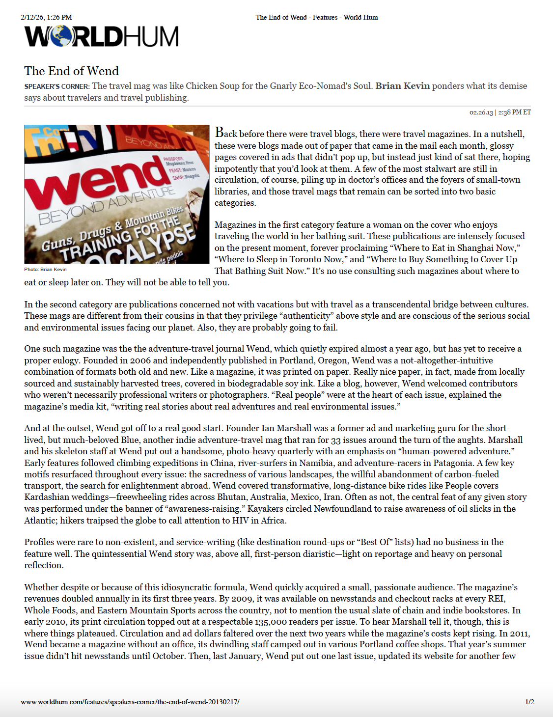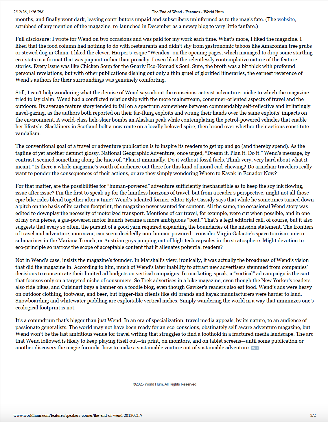 WEND sadly no longer exists but you can read an ‘obituary’ about it that was published on WorldHum as well as in Folio Magazine (via this Wayback Machine link). You can also use that same tool to see WEND’s blog.